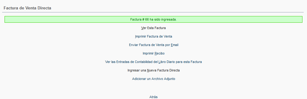 Factura de ventas por correo electrónico: Si ha incluido una dirección de correo electrónico en los detalles del cliente, al seleccionar esta opción, se enviará por correo electrónico una copia de la factura en formato .pdf a su cliente. No es necesario imprimir. Después de seleccionar esta opción, aparecerá una nueva pantalla en la que se indicará ‘ Factura ##### (El número de la factura) se ha enviado por correo electrónico al destino: Dirección de correo electrónico del cliente